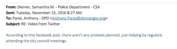 Westword obtained these e-mails through an open-records request asking for documents pertaining to the homeless sweeps. But a follow-up request asking for similar e-mails sent by members of the Intelligence Unit – messages containing social-media screen shots or monitoring of protest activity – was denied. “We believe that the Department’s interest in maintaining the confidentiality of intelligence information coupled with the public interest in maintaining public safety at possible protest events outweigh any public purpose to be served by release of the information,” the city said in denying the request.
