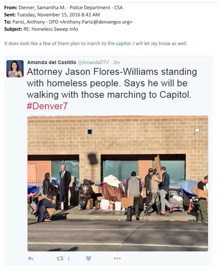 On November 15, the day that a renewed crackdown on homeless encampments began near the Denver Rescue Mission, DPD Intelligence Analyst Sergeant Antony Parisi sent an e-mail to Deputy Chief David Quinones: