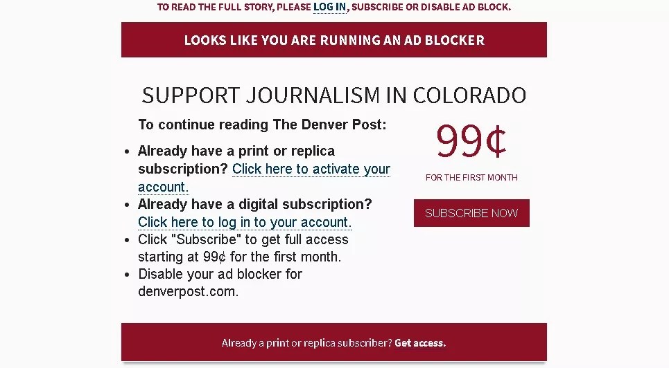 This is the notice readers see when they click on one too many Denver Post articles these days.