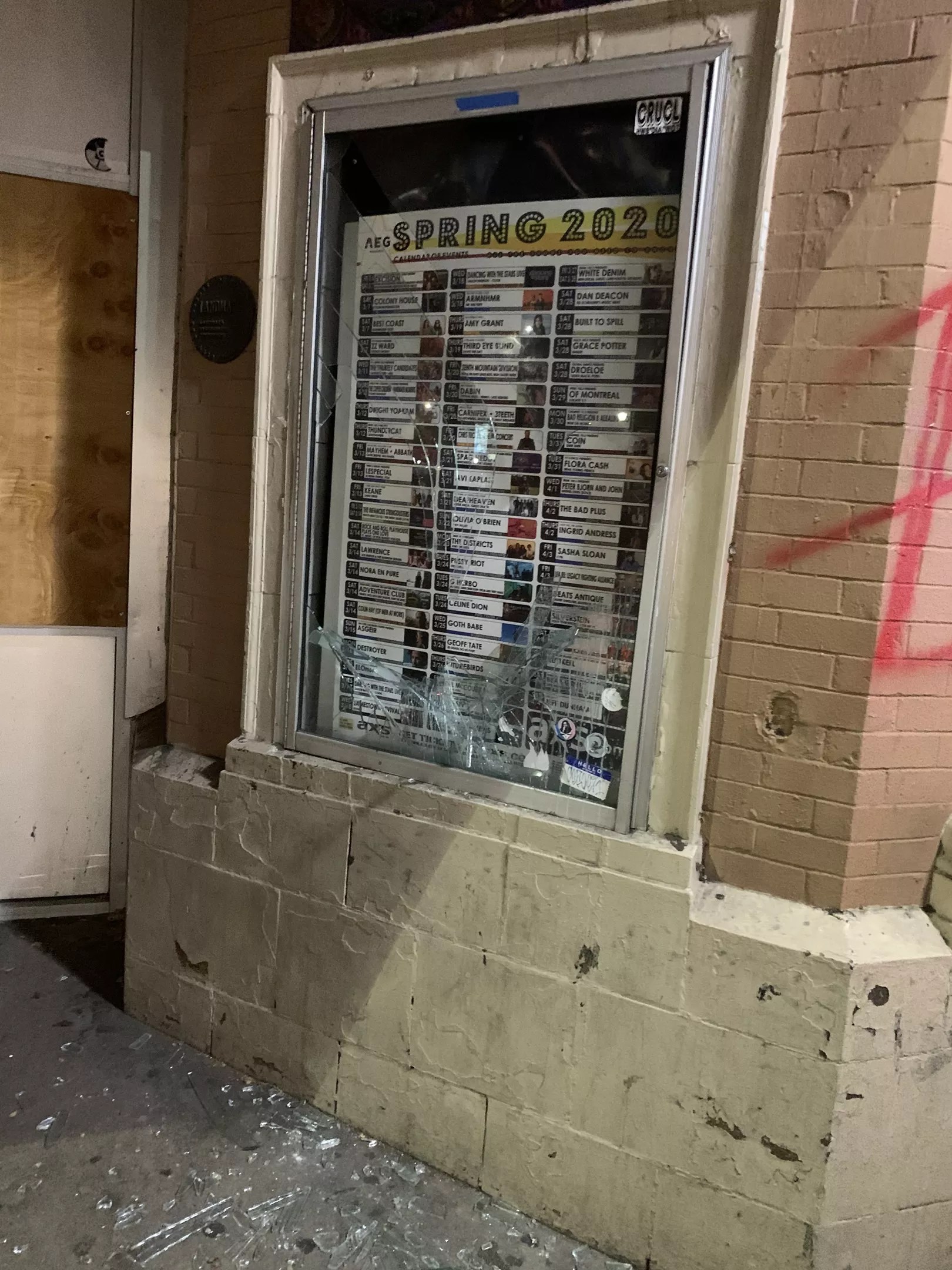 Protesters smashed a display case outside the Ogden Theatre.
