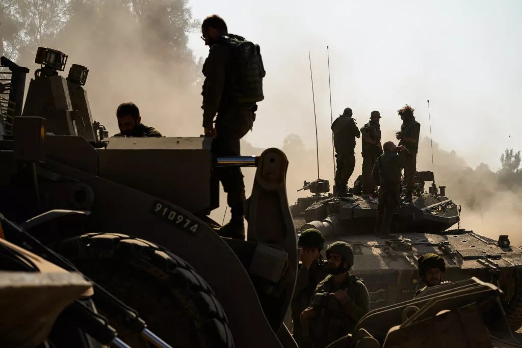 Soldiers in a holding area outside Kibbutz Be’eri on October 14 in Be’eri, Israel; over 110 residents of the small community were killed during the attack on October 7.