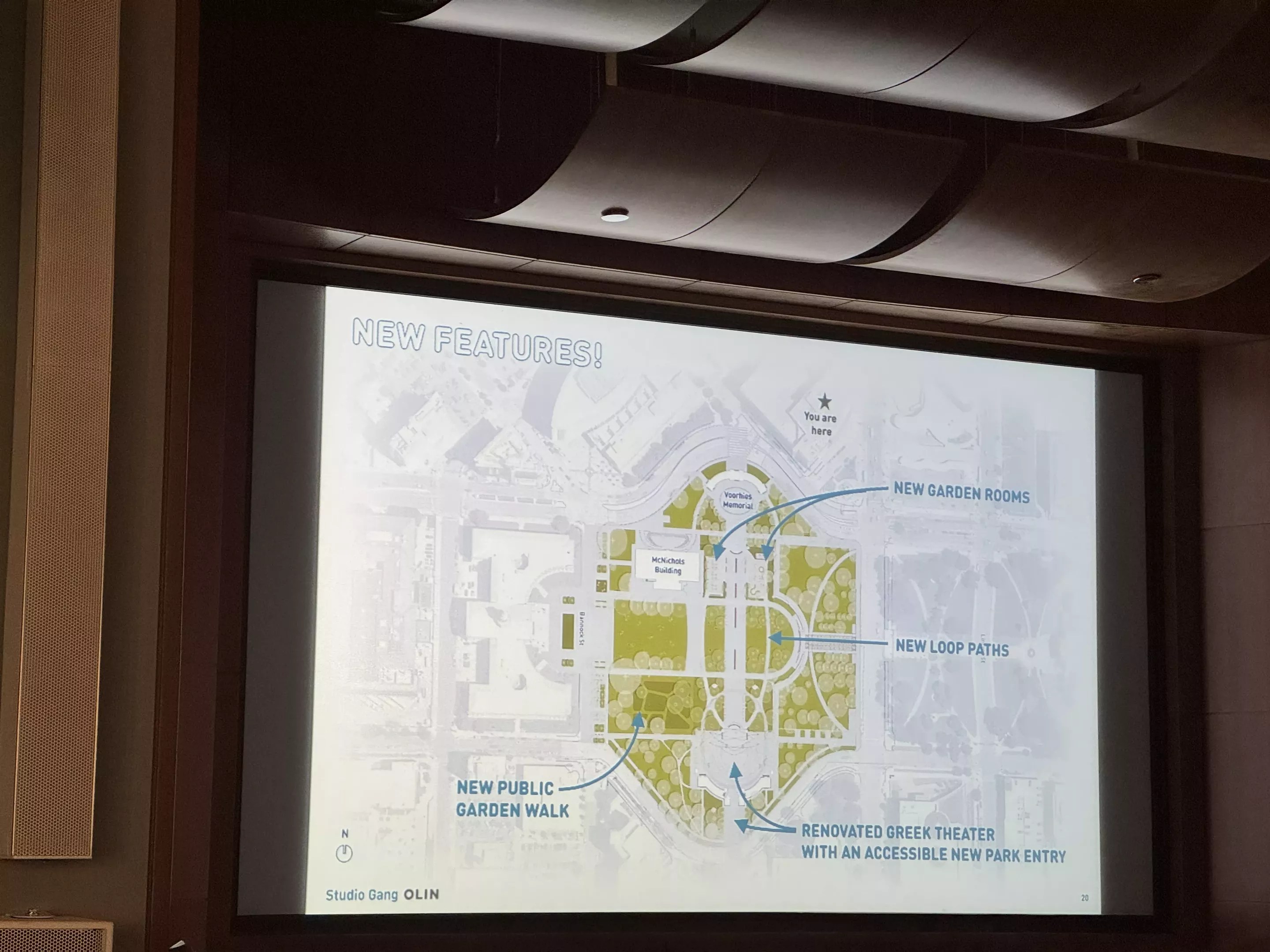 “Garden rooms” on the east and west sides of the promenade will reorient current planting plots, which are now only on the west side of the promenade. Additionally, a new public garden walk will be placed on the southwest side of the park between the Greek Theater and the City and County Building. Both spaces will be planted with year-round or perennial foliage.