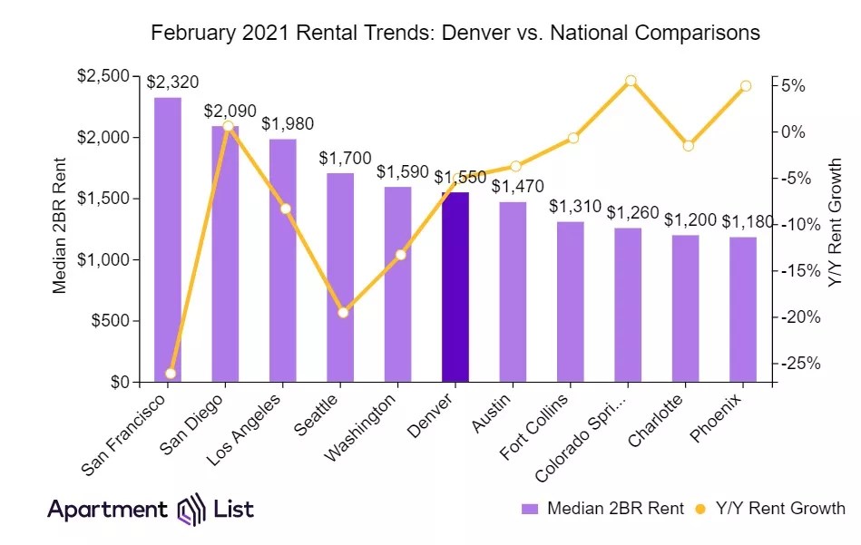 The March 2021 Rent Report from Apartment List reveals that in February, the most recent period for which data is available, the average rent in Denver increased 0.9 percent over the previous month. Even so, rent in the city is still down by 5.1 percent year over year, putting its trend line well below that of Colorado and the country as a whole over the past twelve months.