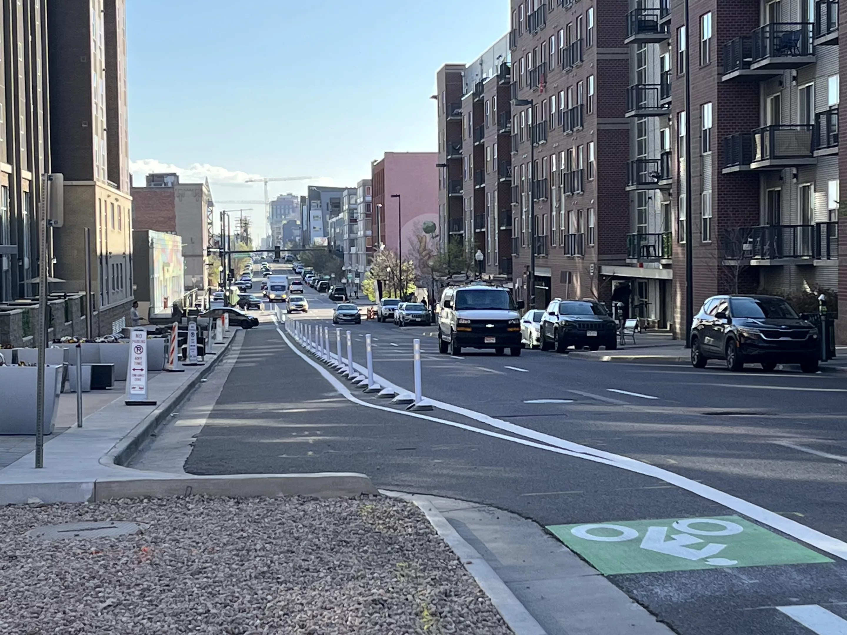 The new protected bike lanes will stretch from the Cherry Creek trail to Broadway along Market and Blake – adding a total of two miles of protected bike-lane infrastructure to downtown, according to DOTI. In addition to safety improvements, DOTI says the bike lanes “will provide dedicated space on the street for people to bike and scooter, reducing concerns about scooter riding on sidewalks and improving the environment for people walking.”