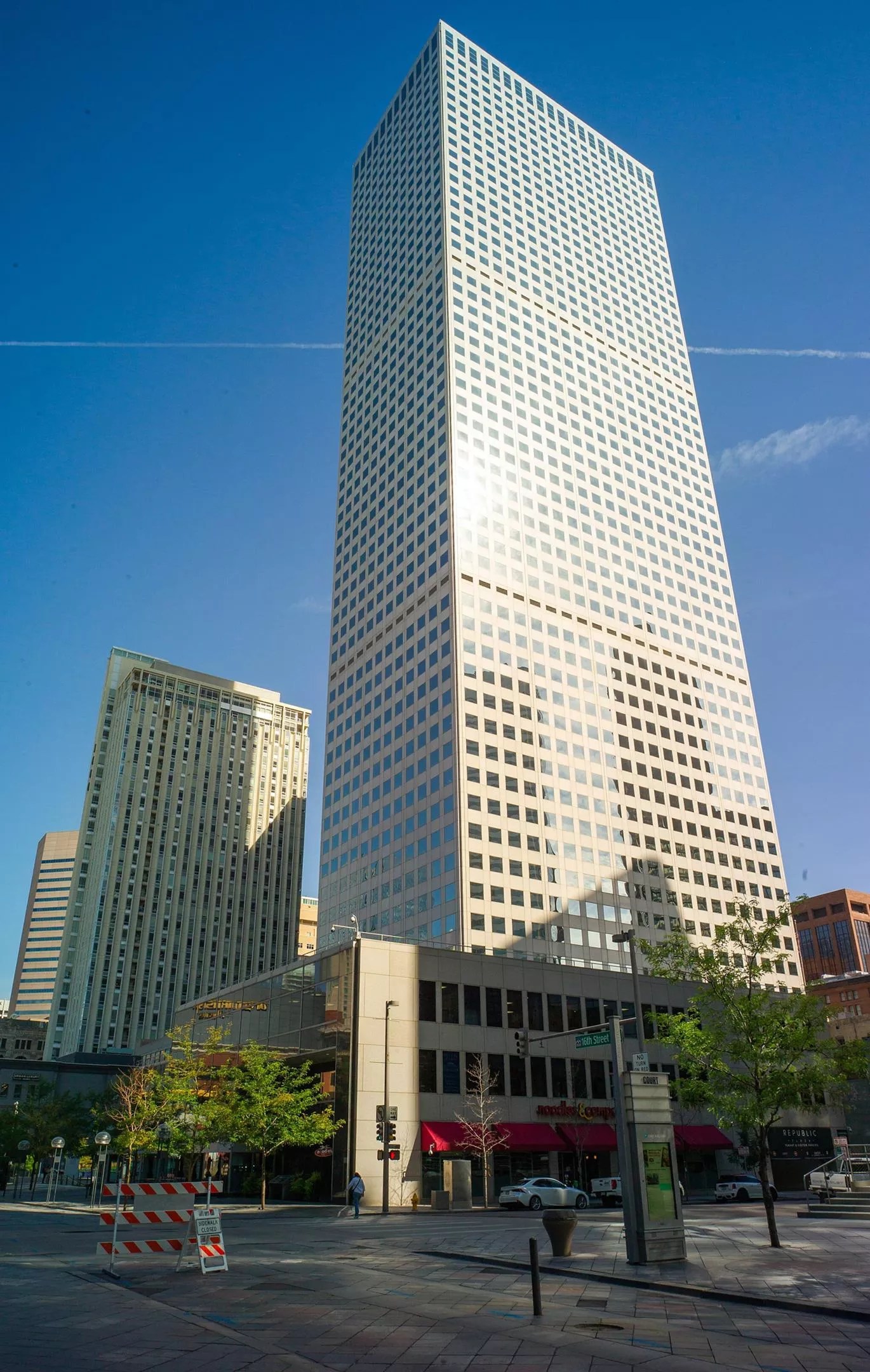 Denver’s modern skyline started emerging in 1957, when a 28-story building was constructed on 17th Street. Initially called the First National Bank Building, this new skyscraper changed its name to 621 17th Street when First National merged with Wells Fargo in 1996. By then, a second tower had been added at 633 17th Street. The two concrete-and-glass-striped buildings form a plaza on the corner of 17th and California streets.
