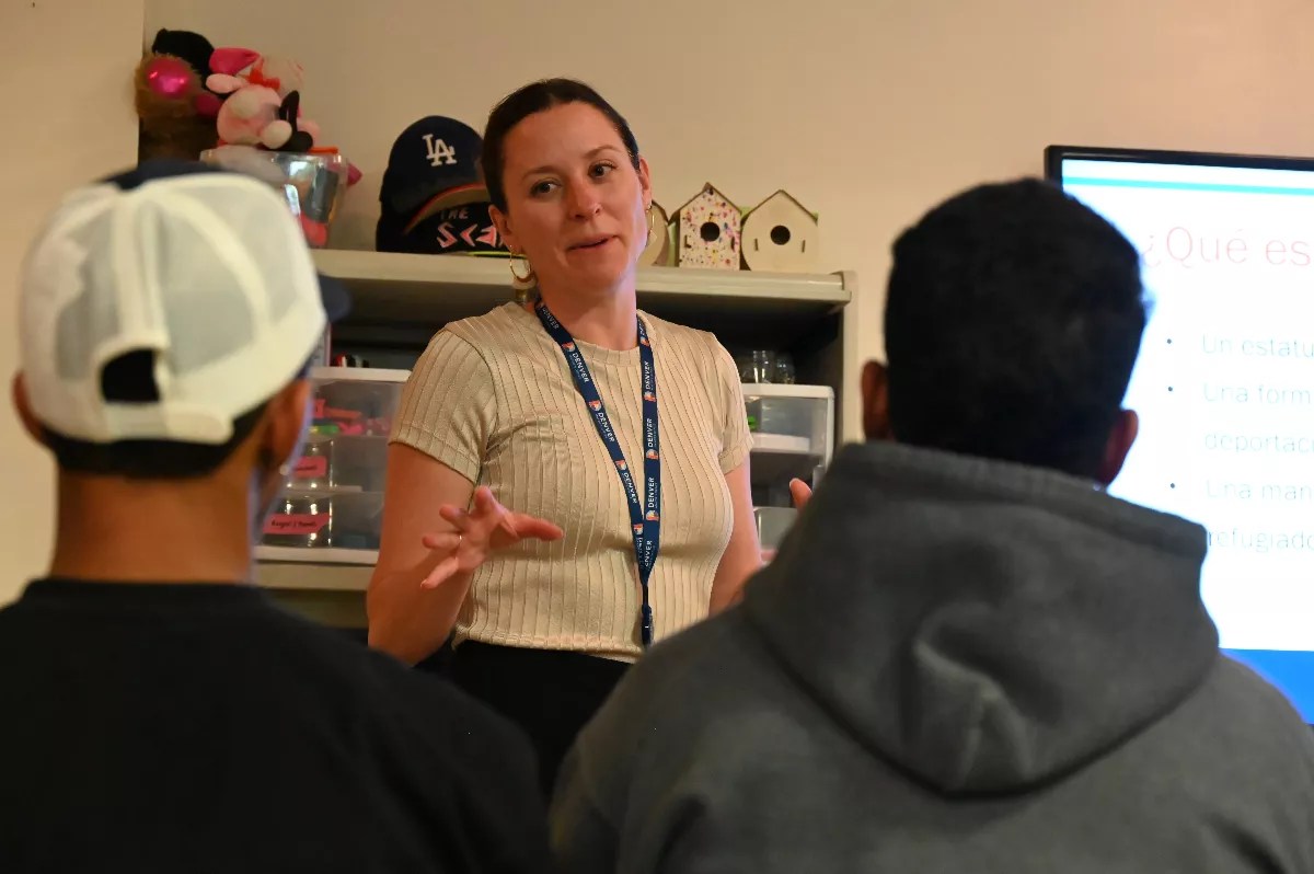 Sarah Plastino, director of Denver’s Newcomer Services Program, explains to migrants what asylum is.
