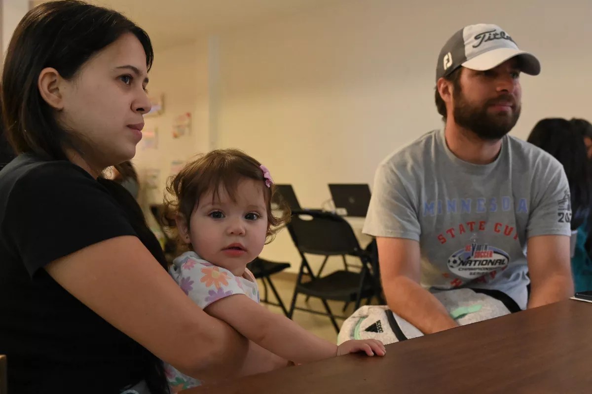 William Rodriguez and Marcy Mora sit with their daughter, Eliza, while participating in the Denver Asylum Seekers Program.