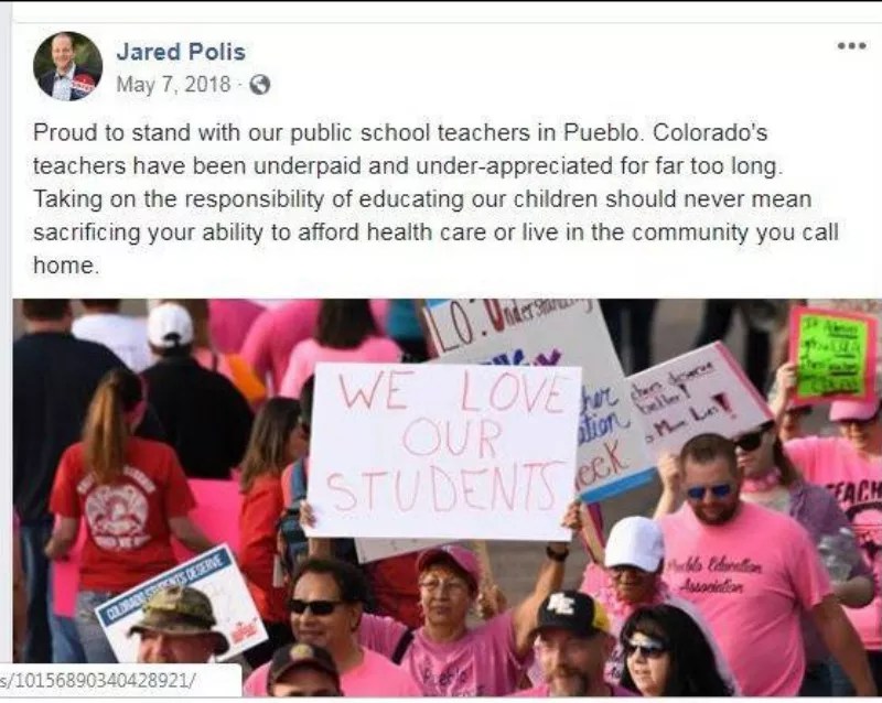 The text the DCTA appended to the item recalls that “Candidate Jared Polis stood with striking teachers last spring. We hope Governor Polis supports Denver educators’ right to strike now.”