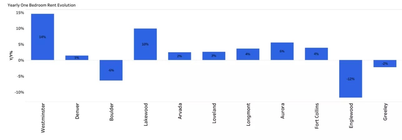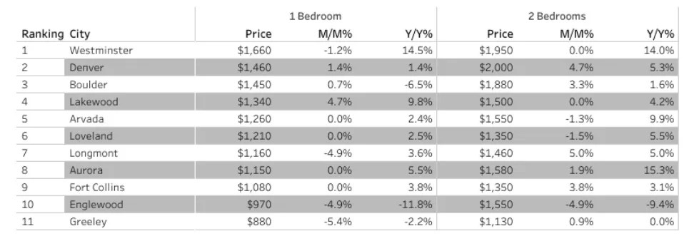 Of the other cities, only Englewood and Greeley have median one-bedroom costs below $1,000. Median prices were static or higher in eight of the eleven cities for both apartment types.
