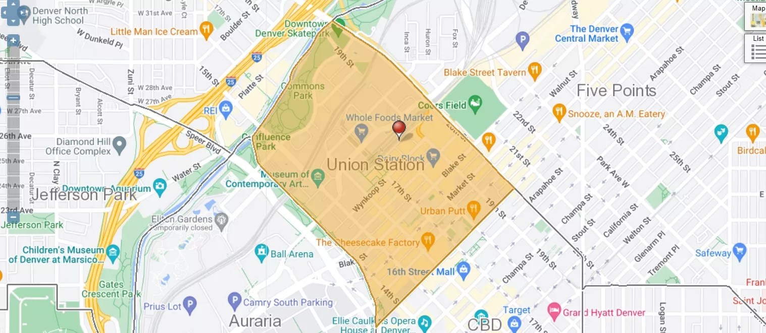 Union Station isn’t one of Denver’s 78 official neighborhoods. However, the DPD carefully tracks offenses using boundaries seen in this screen capture from the Denver Crime Map maintained by the city; the Denver Skatepark is on the northern edge.