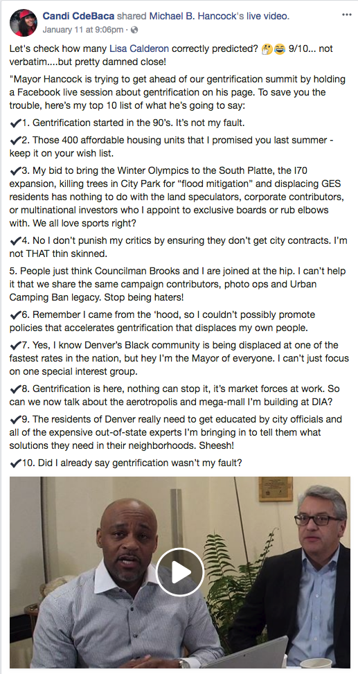 It can’t be said that the mayor’s office is not making efforts to address concerns by residents who say they’re being priced out of Denver. Two days before the summit, Hancock’s office hosted a Facebook Live video to address gentrification, which turned into an hour-long discussion with five panelists.