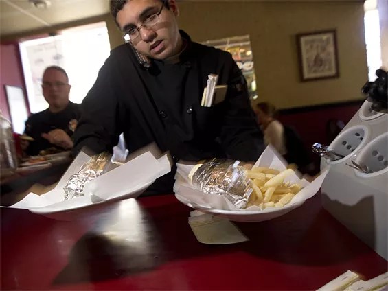 Obeid Kaifo multi-tasking at the Shish Kabab Grill.