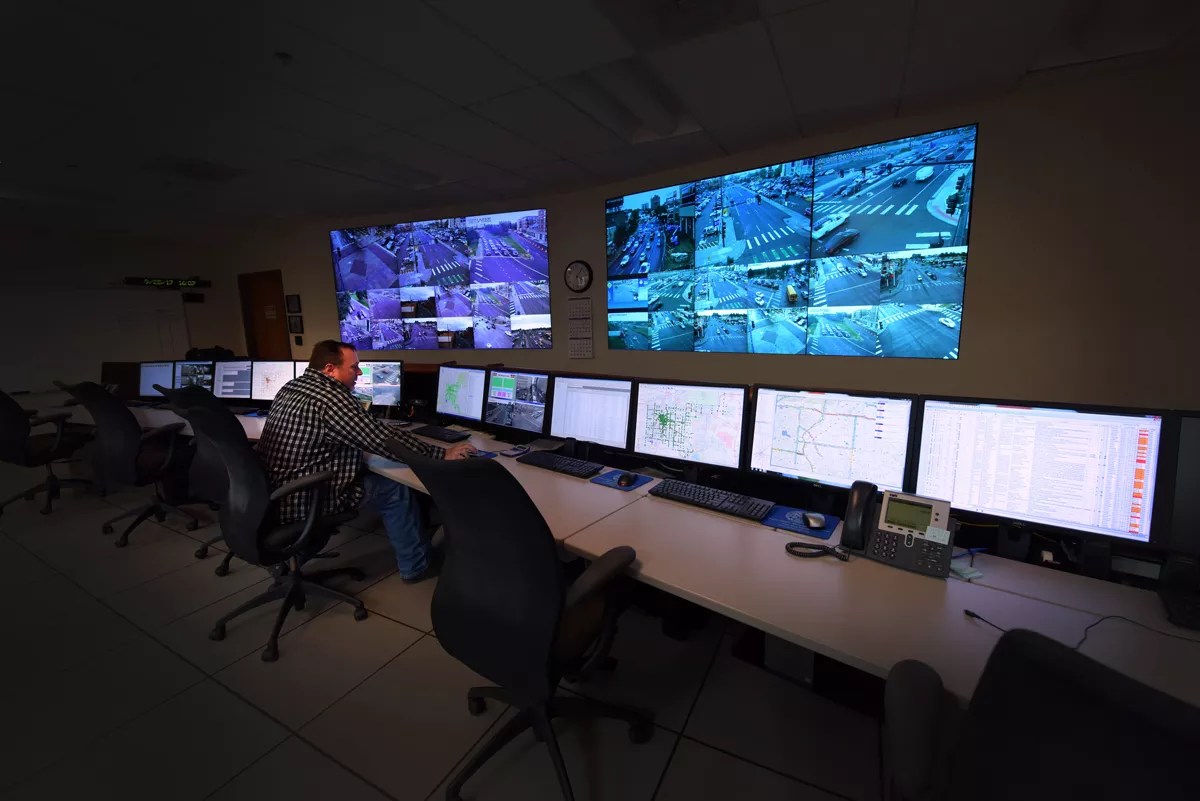 Meulemans may not be all-seeing, but he sees plenty. Located on the fifth floor of the Wellington Webb Building, the TMC features a wall of flat-screens, projecting dozens of shifting images from 502 cameras mounted at intersections across the city. The transportation nerve center receives not just visuals, but a constant stream of data, confirming that traffic lights are working and are properly synched for peak flows, special events or off-peak driving.