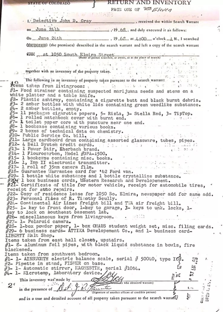The name didn’t mean anything to them at the time, but the DPD detectives would later learn that Tim Scully was one of the country’s most important psychedelics manufacturers. A known associate of West Coast LSD impresario Owsley Stanley and the Grateful Dead, Scully was already being investigated by federal agents in California. No one knew that he had secretly moved his operation to Denver the year before, running a lab in a City Park neighborhood that had produced hundreds of thousands of hits of pure, crystalline LSD.