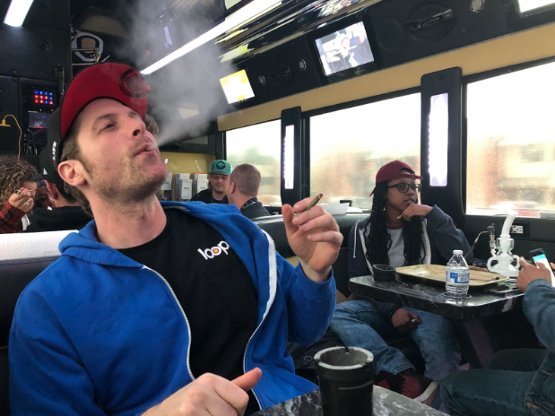 The two started the Loopr mobile cannabis company in 2016, turning a bus into a short-term private smoker’s lounge for guests 21 and older who sign a consent agreement to participate. “Welcome to your 4/20 afternoon. We’re headed out to Colorado Harvest Company. It’s about a thirty-minute ride, so get nice and highery on the way,” Taback announced over the intercom after everyone had boarded the smoke-filled vessel. “We have Harmony providing some dabs for you on the way.”