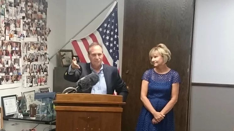 Ed Perlmutter at the July 11 press conference, with his wife, Nancy, at his side.