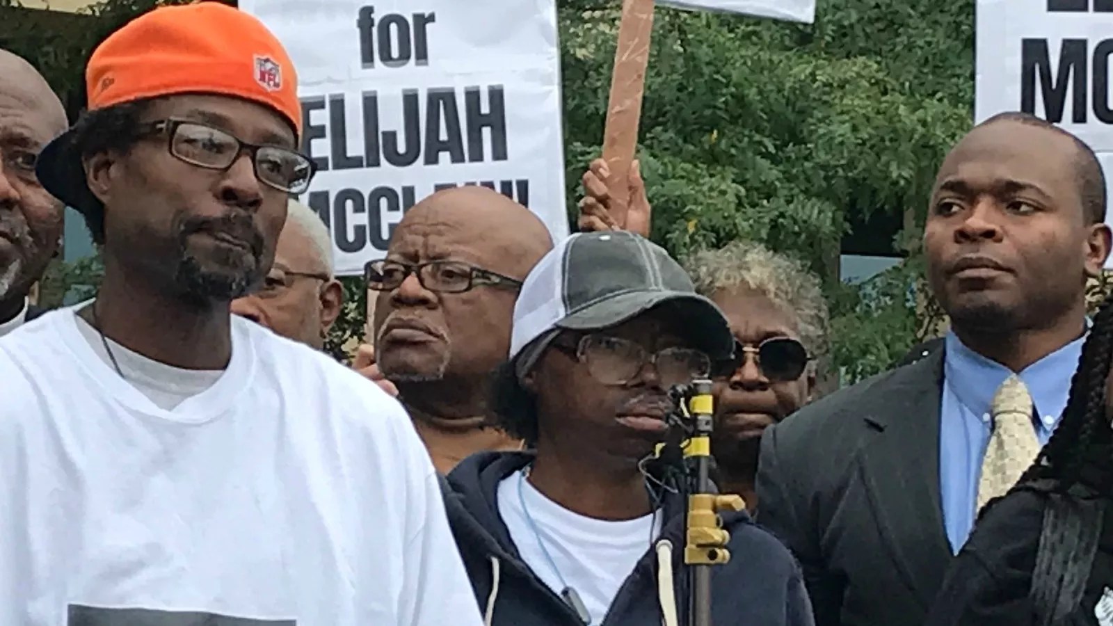 LaWayne Mosley, far left, and Sheneen McClain, center, spoke on behalf of their son, Elijah McClain.
