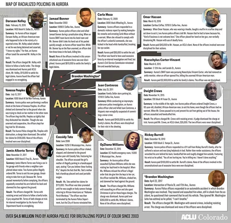 To demonstrate that the Aurora police have a pattern and practice of using excessive force against people of color, the ACLU assembled a graphic highlighting thirteen other examples, many of which Westword had covered.