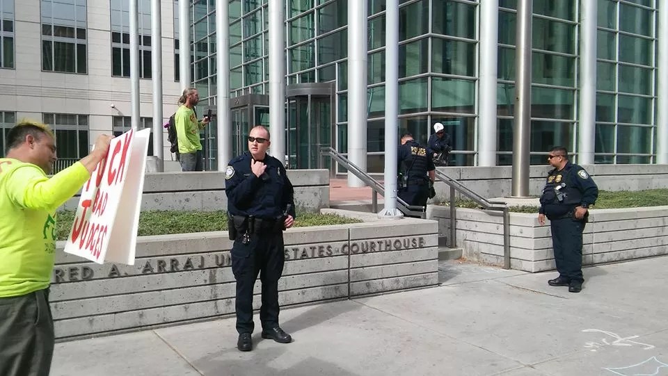 Brandt and Brown in action outside of a Denver courthouse. Of the photo, Brandt wrote, “Telling federal cops to drink a big fat glass of shut the f**k up”.