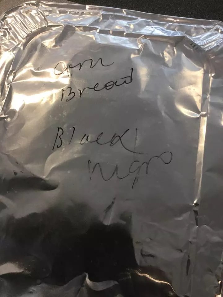 When the food was delivered to the church, the lids of two of the containers of cornbread had this message: “cornbread Black/negro.” Porter was shocked and thought they referred to the fact that he presides over a black church. “We were very offended,” he says. “We didn’t understand why that was written on our food. If you’re an African-American and you received that, you don’t know if they put something in the food or not.”