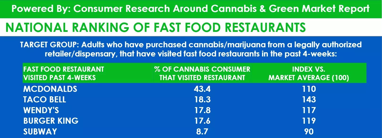 “McDonald’s wins by virtue of the sheer number of locations…by default, really,” said Jeff Stein, vice president of Consumer Research Around Cannabis, in announcing the results. “Those competitors that better understand cannabis users and their consumer habits can certainly close the gap by integrating what they learn through their marketing efforts.”