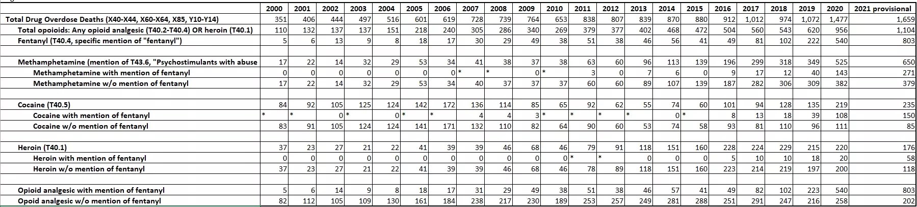 The increases in overdose deaths from various drugs are even more striking in the graphic below, which offers data for each year from 2000 to 2021: