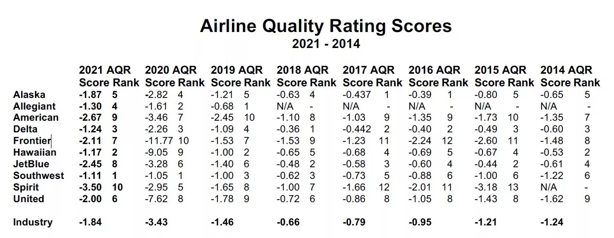 A move up the roster in 2021 didn’t necessarily mean that performance had improved in general, though. The report’s introduction points out that overall quality dipped industry-wide, with fewer planes arriving on time, more baggage being mishandled and more ticketed passengers getting bumped from flights in 2021 than in 2020.