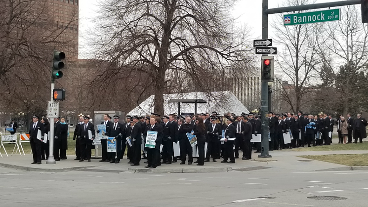 Frontier Airlines pilots at a protest in downtown Denver in December 2017.