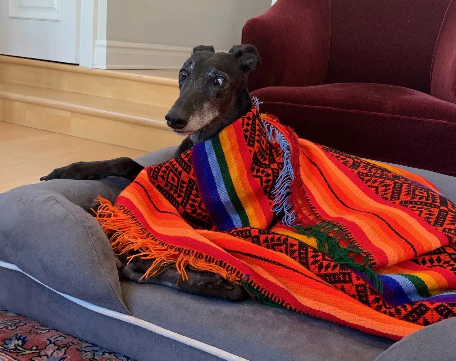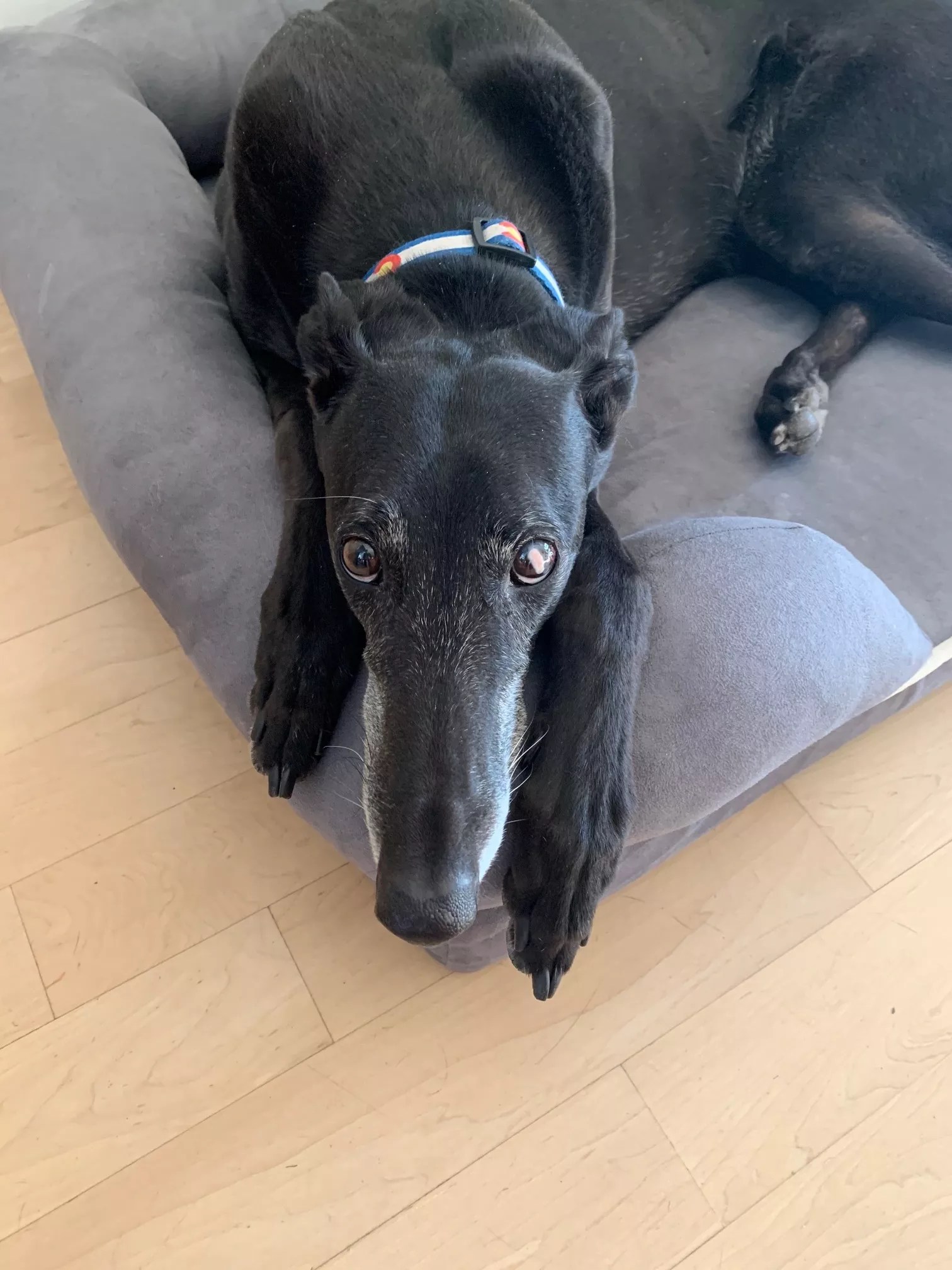 Last summer, eager to get out of the house for a socially distant change of scenery, we took Cleo camping in the Sangre de Cristo mountains. Greyhounds are not camping dogs; their long lines, graceful curves and sharp angles make them elegant but not particularly sturdy. It so happened that we chose an anomalous Colorado weekend for our getaway – it started raining as we pitched our tent on Friday evening and stopped as we pulled out of the campsite on Sunday morning. She was so gentle, abstaining from judgment as we sat there, 24 hours into our ordeal, two men and a greyhound in a three-person tent, listening to the rain fleck off the sides. She looked at us as if to say not “Why are you doing this to me?” (which would have been fair) but instead “Well, boys, at least we are together…I guess?”