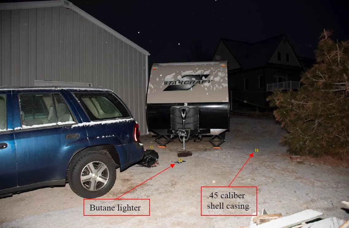 A photo from the scene of the shooting shows the location of the butane lighter and the shell casing.