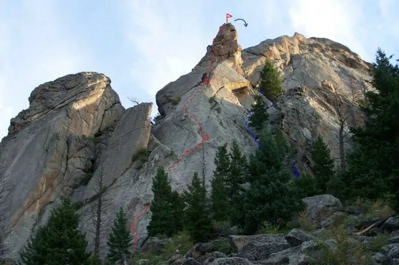 This photo/illustration shows the so-called Batman and Robin route up the Batman Pinnacle.