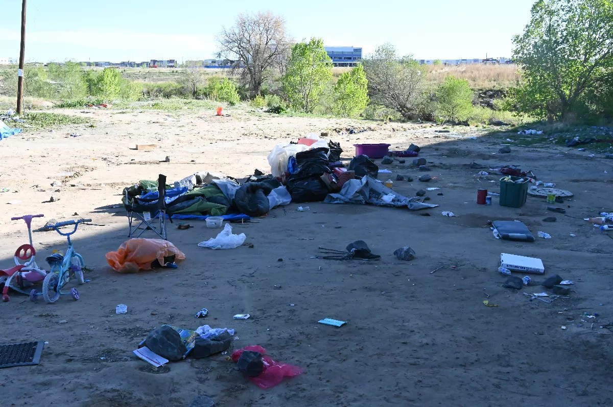 Denver police and city officials cleared a hidden migrant encampment on Wednesday, May 8, but nearly all of the residents of the encampment were gone by the time the sweep started.