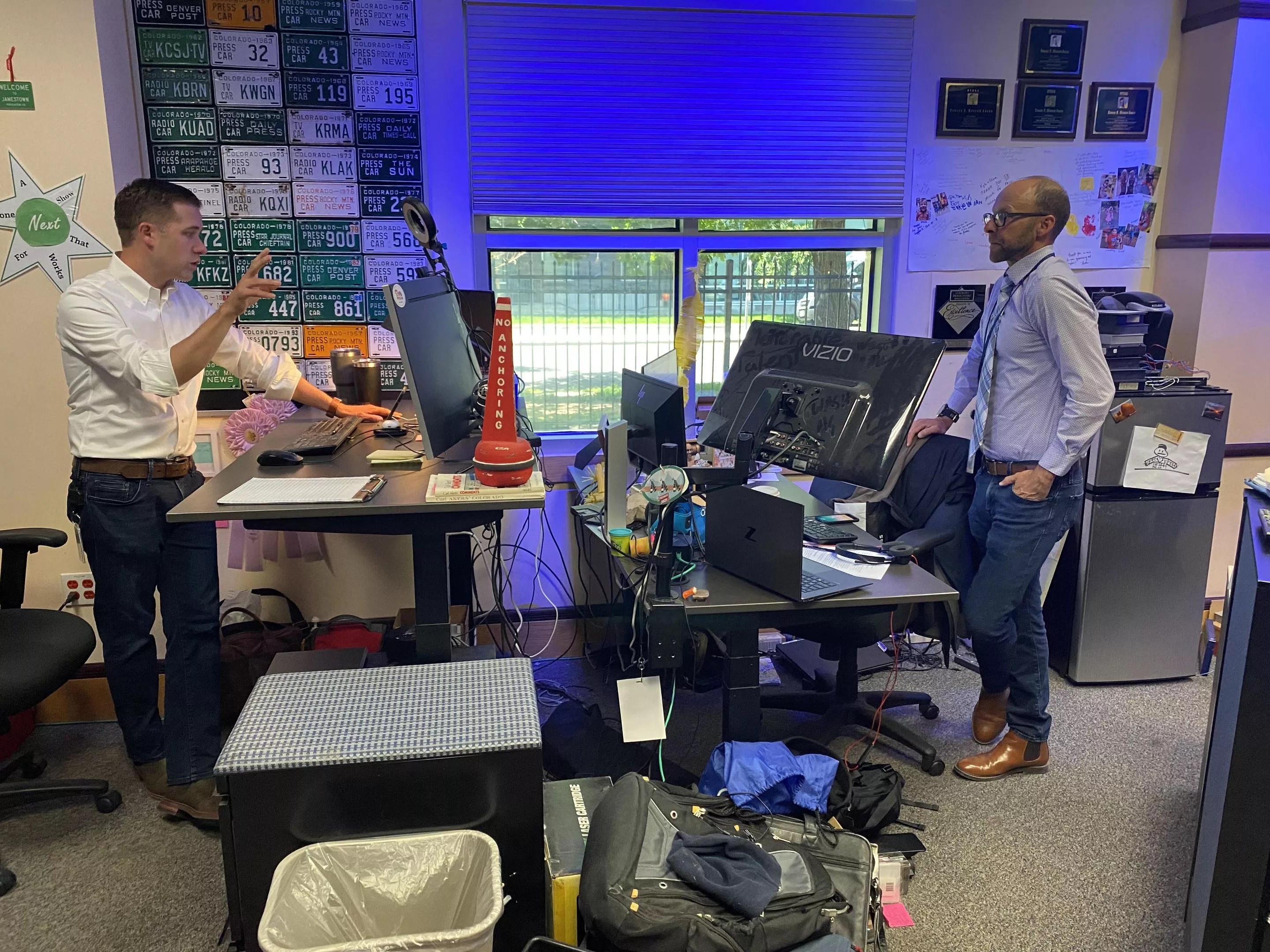 In addition to hosting Next, Clark co-anchors the 9 and 10 p.m. roundups for 9News – and even after returning to the home he shares with his wife and two young daughters, he finds it hard to unplug. Mallory Harris, the producer of Next, says she often wakes up to emails Clark sent at 11:30 p.m. or later filled with concepts sparked by his perusal of viewer comments on various social media feeds. He’s a master of Facebook and X, and improving on Instagram. Kyle Clark talking with colleague Marshall Zelinger. Michael Roberts