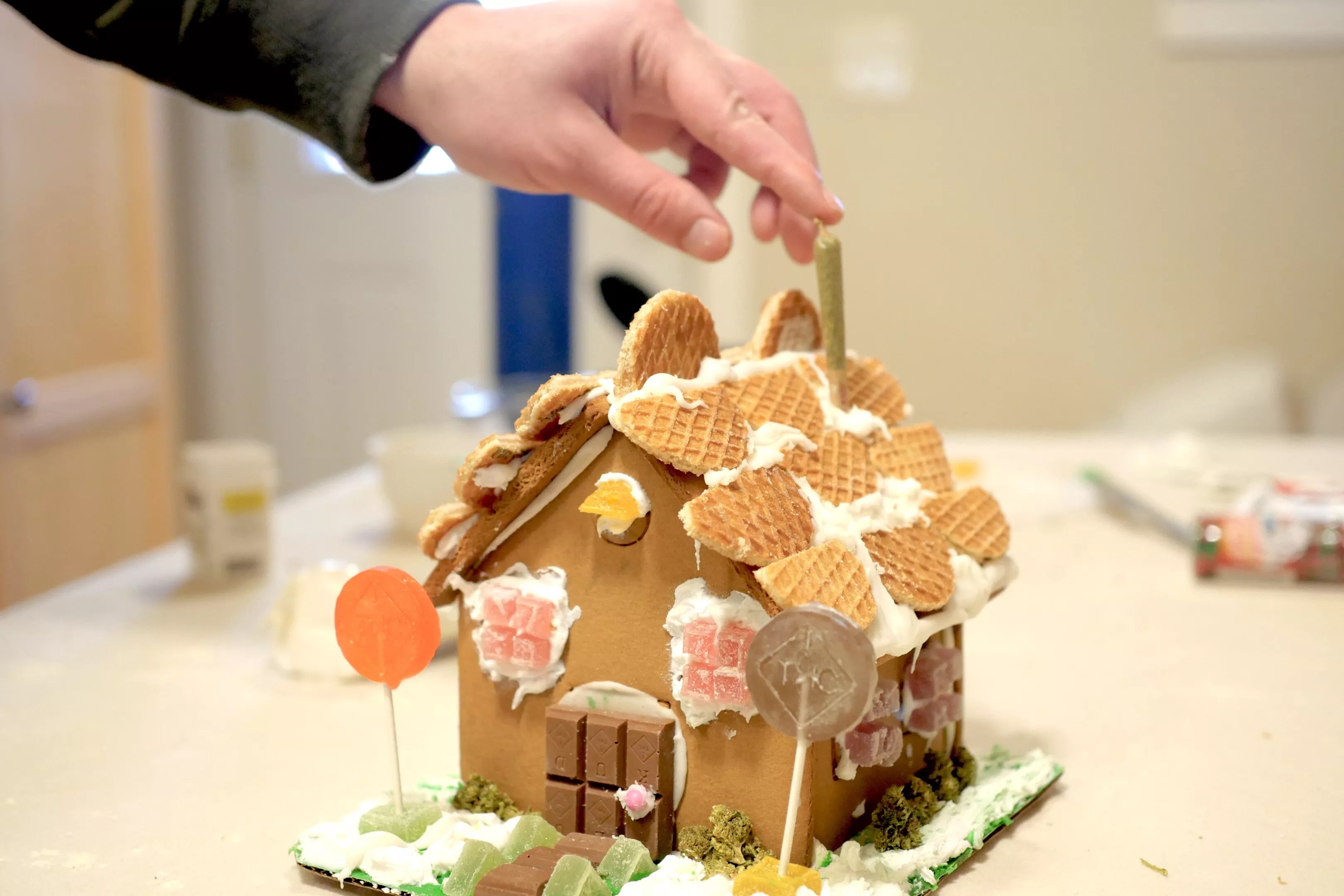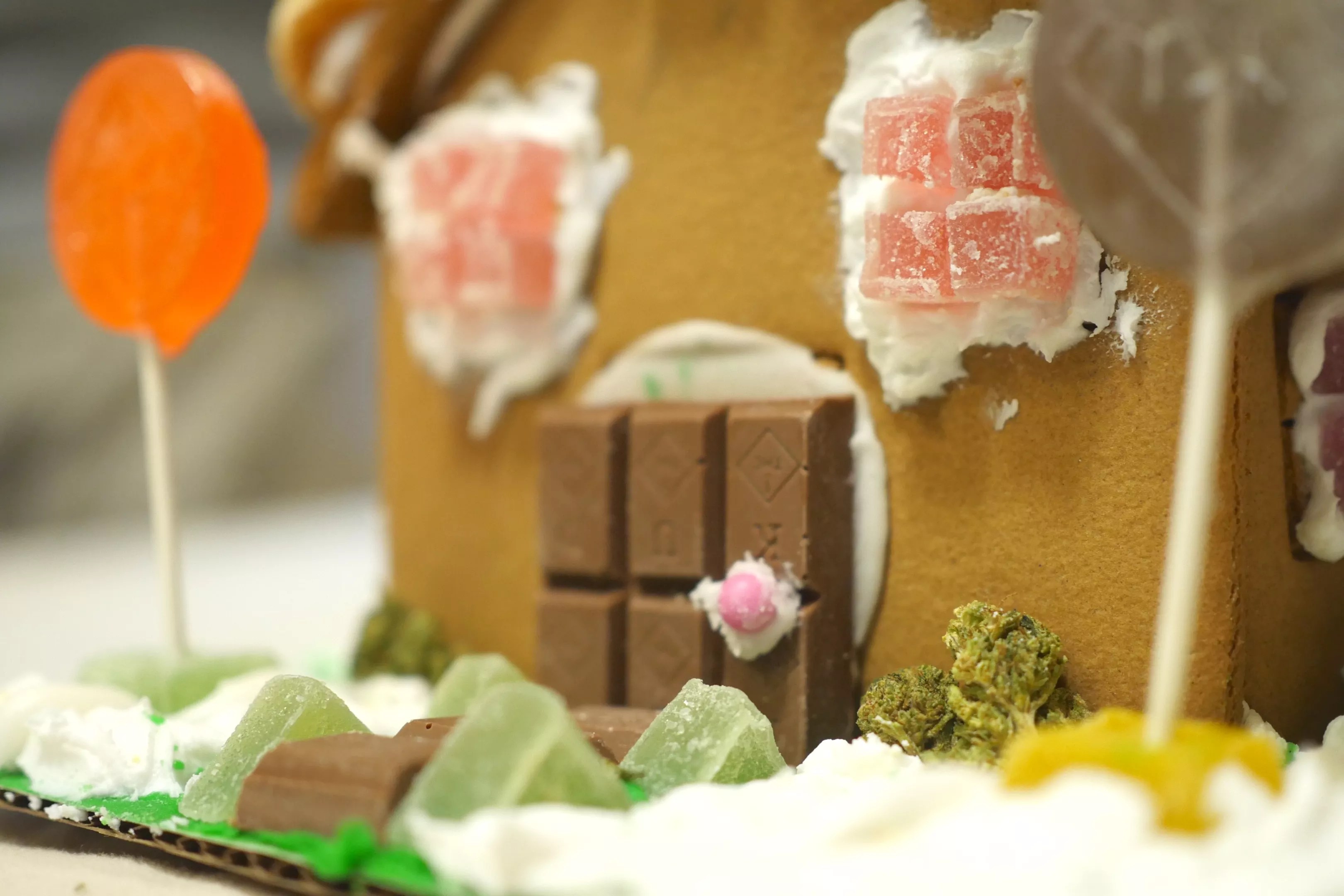 Infused gingerbread Stoned tip: don’t leave your computer near flour. Lauren Antonoff Making the House Make sure your infused sweets aren’t around any kids. Lauren Antonoff Building We laid extra tile on the roof, to prevent spring hail damage. Lauren Antonoff Lollipop trees and weed nugs: a stoner’s dream garden. Lauren Antonoff Gummies, cookies and chocolate bar squares are all very versatile and well-suited for baked imaginations. We cut up the gummies for windows, lawn ornaments and lollipop tree holders, and used the chocolate bar squares as a door and lawn tiles. If you’re flush with buds, why not add a little shrubbery to your winter getaway? And don’t forget a chimney. Every winter cottage needs a chimney. Lauren Antonoff Between the ganjabread and all the edible decorations, our house wound up containing around 800 milligrams. If yours winds up about the same, remember to destroy your work slowly.