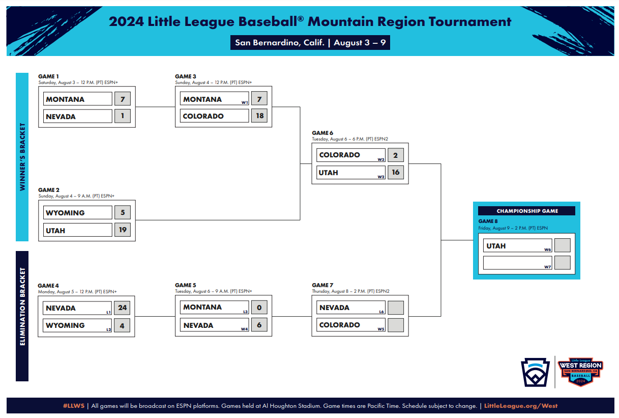 The first step is facing the team from Nevada tomorrow, August 8, at 3 p.m. Mountain Time. Nevada lost its first game but has won two straight to stave off elimination. Should Colorado win its matchup against Nevada, it will move on to the championship game on Friday, August 9, at 3 p.m. Mountain Time.