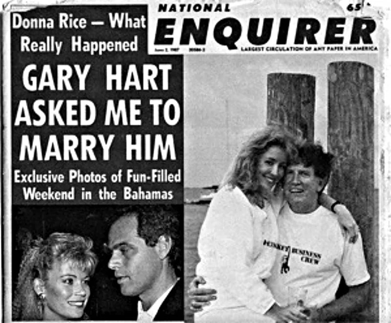 Gary Hart and Donna Rice on the cover of The National Enquirer during the height of the scandal.