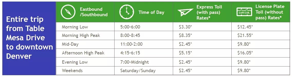 For more details, click to access the Colorado Department of Transportation document “2017 Proposed Toll Rate Adjustment for US 36 and I-25 Central Express Lanes.”