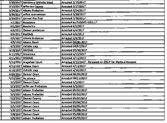Included in the FOIA documents is a spreadsheet that shows ICE arrests in Colorado from October 5, 2016, through May 9, 2017. It details 133 arrests carried out by ICE agents in Colorado: 52 at courthouses (31 in Denver), 44 at probation offices (twelve in Denver), two at Denver pre-trial services, and seven at “RMOMS,” which stands for Rocky Mountain Offender Management Systems. RMOMS is a private company that contracts with municipal and state governments to supervise parolees, people on probation and individuals assigned to drug-treatment programs.
