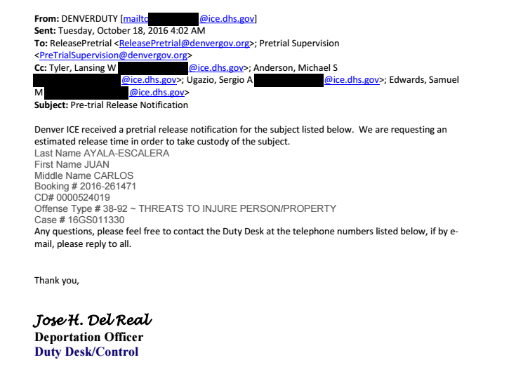 The new law will soon be put to the test: After Westword received the FOIA documents, we sent an open-records request to Denver’s Department of Public Safety, which produced multiple emails between ICE officers and Denver employees who work with pre-trial services. The records show that one “deportation officer” with ICE, Jose H. DelReal, has been communicating with at least three Denver employees to obtain specific times when ICE targets would show up at pre-trial service appointments. “We are requesting an estimated release time in order to take custody of the subject,” DelReal wrote in an October 18 email.