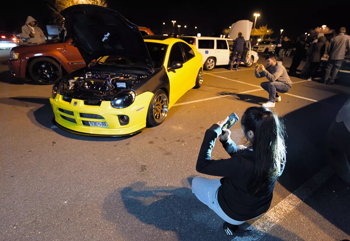 Overfilling shopping-center parking lots with hundreds of cars and motorcycles, drivers talk shop and check out each others’ rides, bragging about how theirs is the fastest. Then they all leave together, heading for the next stop.