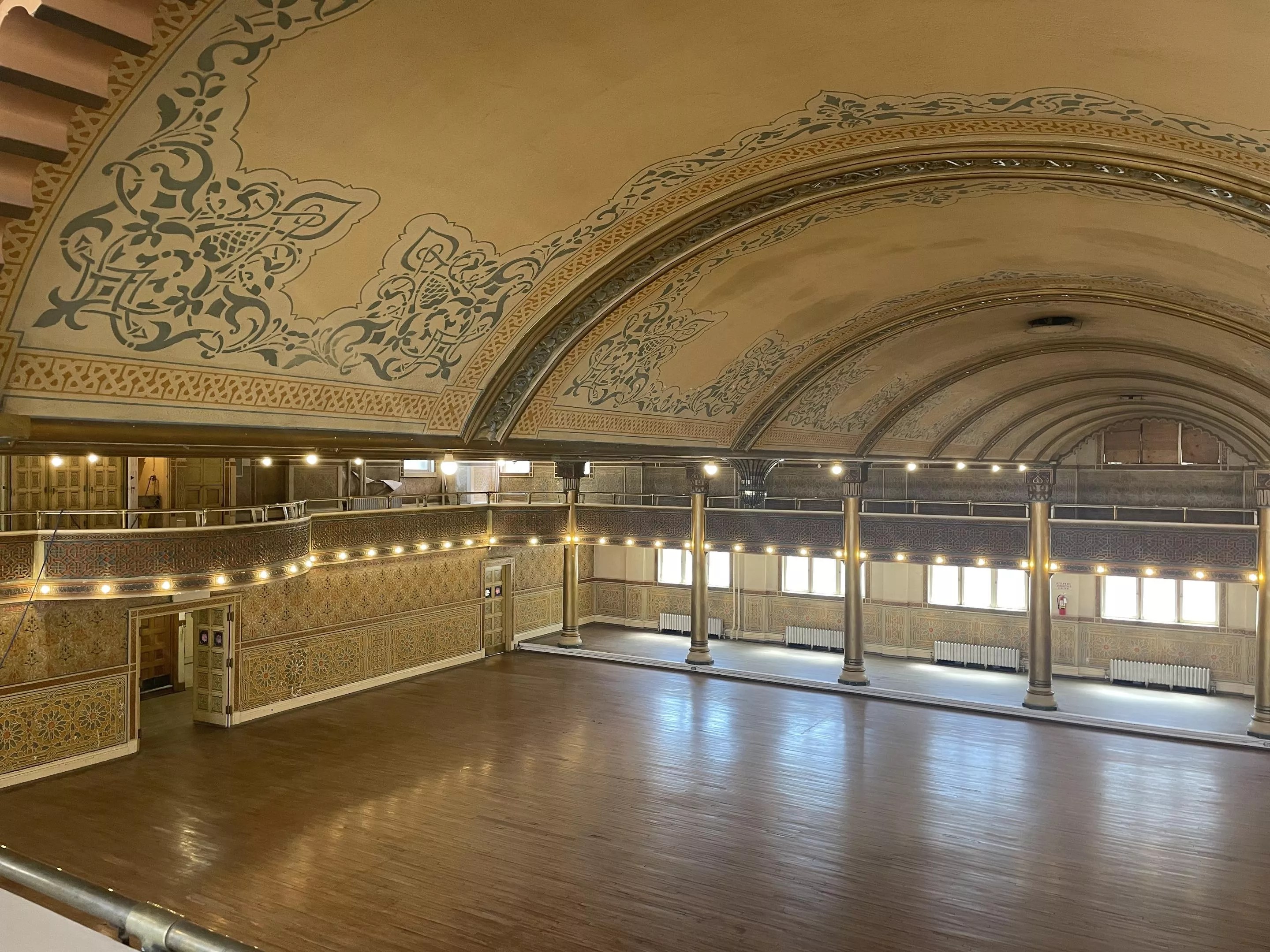 On the second floor of the building is the ballroom, where the Alhambra-style architecture transports people into a magical world with a scalloped ceiling and balcony that wraps around the entire space, taking up both the second and third floors.