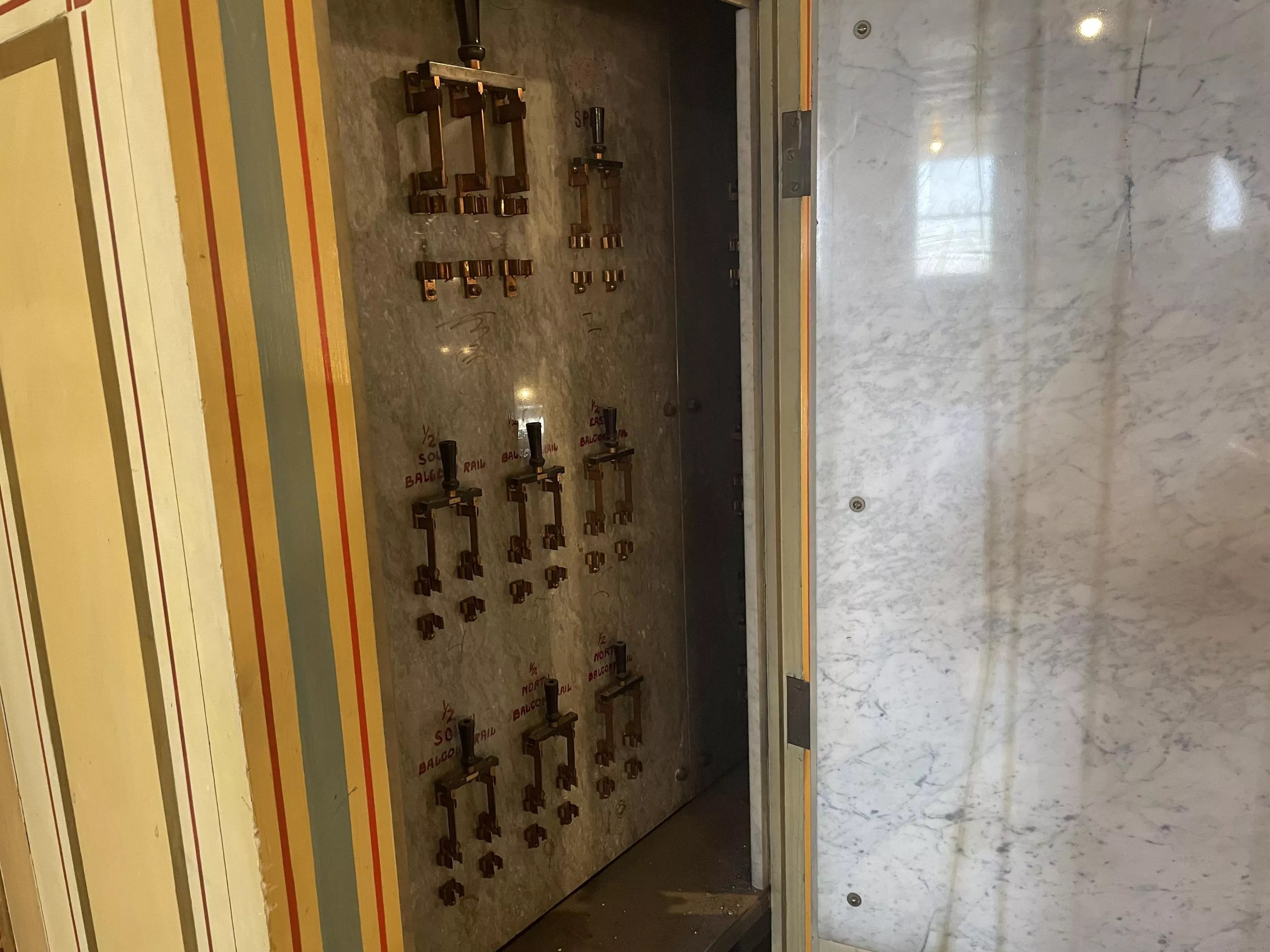 Even the utility spaces in the building are elegant, with the old-school electrical panel and circuit board just as intriguing as the ornate stained glass and patterned ceilings. The electrical panel is wrapped in marble so it wouldn’t be a fire hazard to the mostly wood building.