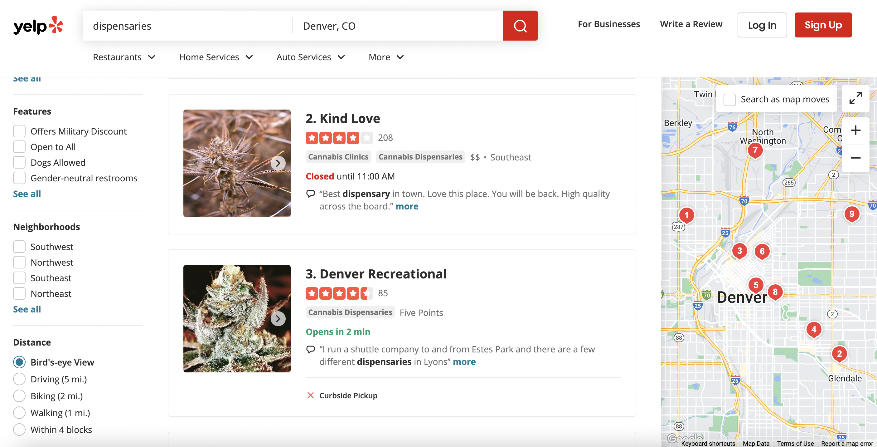 As a result, search-engine results for a local dispensary typically list Yelp above the vast majority of marijuana-centered websites.