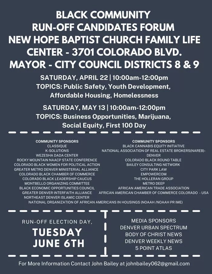 As prominent leader in the Black community, Bailey has hosted numerous events aimed at bettering the lives of Denver residents, including a well-attended discussion on youth violence that took place at New Hope Church on March 28.
