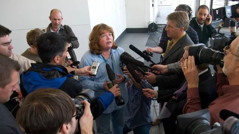 Former Rocky Mountain News reporter Lynn Bartels surrounded by press after the announcement that the paper would be closing.