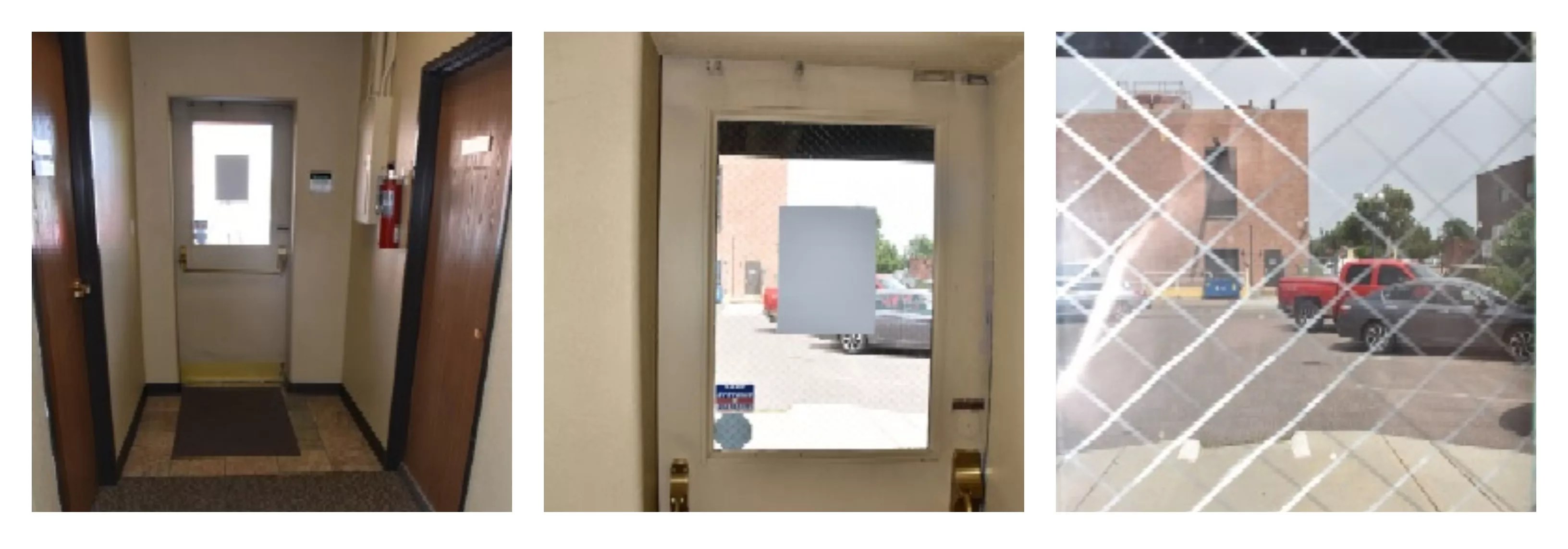 Decision-letter captions for three images taken after June 21, from left: “East door with end of curved wall on left;” “East door with view of parking lot, Qwest building visible;” “East door window close-up.”