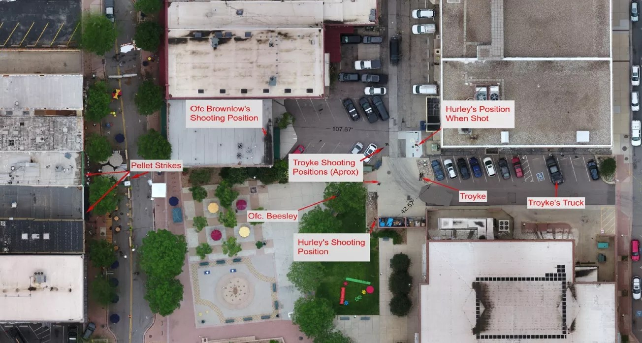 Meanwhile, Hall heard a third round of shots as Brownlow stood at the east door “with his weapon drawn and pointed at the window.” At that point, he lost sight of Troyke, but soon spotted “a man with a red shirt” (Hurley) holding a handgun and a rifle, which he’d picked up. After Hurley paused in place, it looked to Brownlow that he “was either reloading the rifle or trying to fix something while holstering his pistol,” the letter reports.