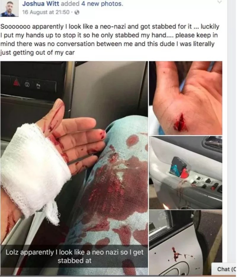 “Sooooooo apparently I look like a neo-nazi and got stabbed for it,” he wrote. “Luckily I put my hands up to stop it so he only stabbed my hand…. please keep in mind there was no conversation between me and this dude I was literally just getting out of my car.”