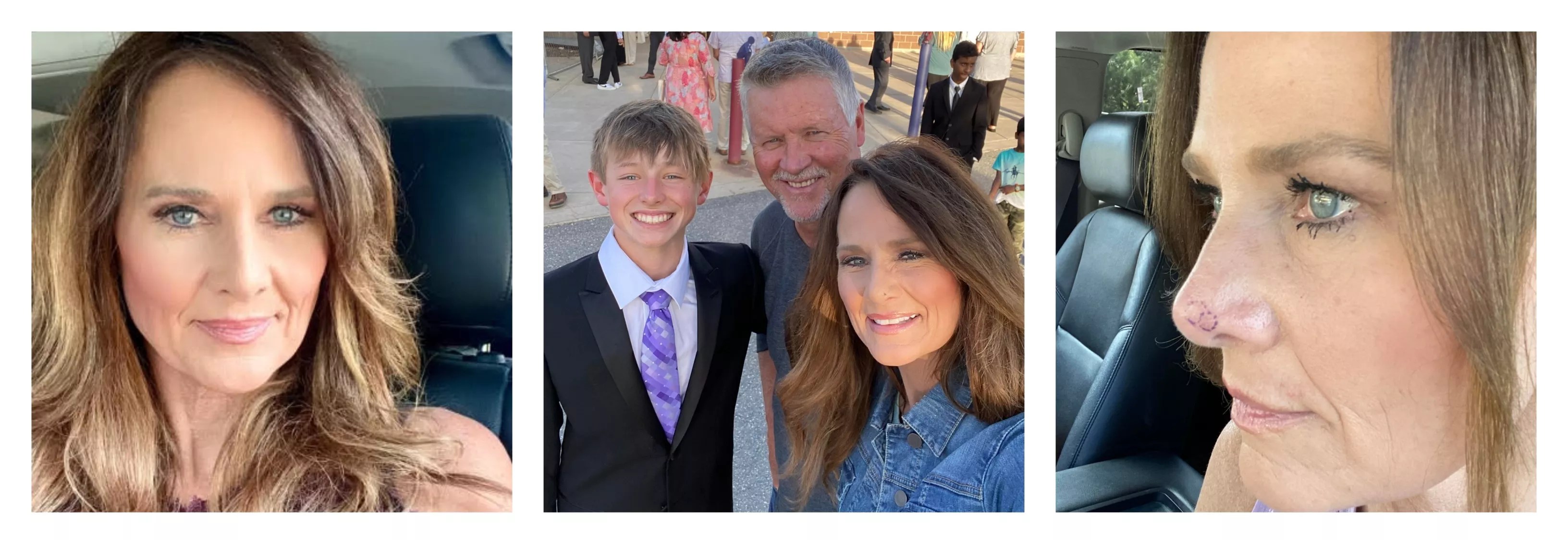 (From left) A portrait of Kathy Sabine taken shortly before surgery; a shot from her son’s eighth-grade continuation in which a small spot can be seen on her nose; a close-up of the surgical area, outlined with a pen.