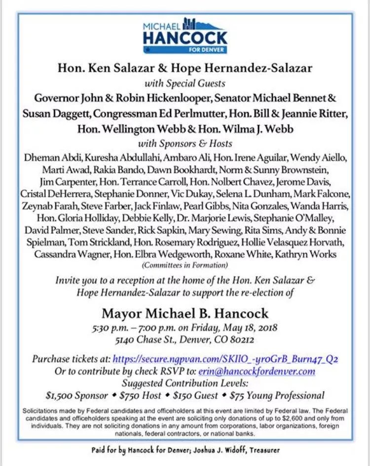 Neither Salazar’s nor any of the speeches that followed mentioned Hancock’s recent woes in the media or any of his emerging challengers, such as Denver entrepreneur Kayvan Khalatbari, who out-raised Hancock during the first quarter this year.